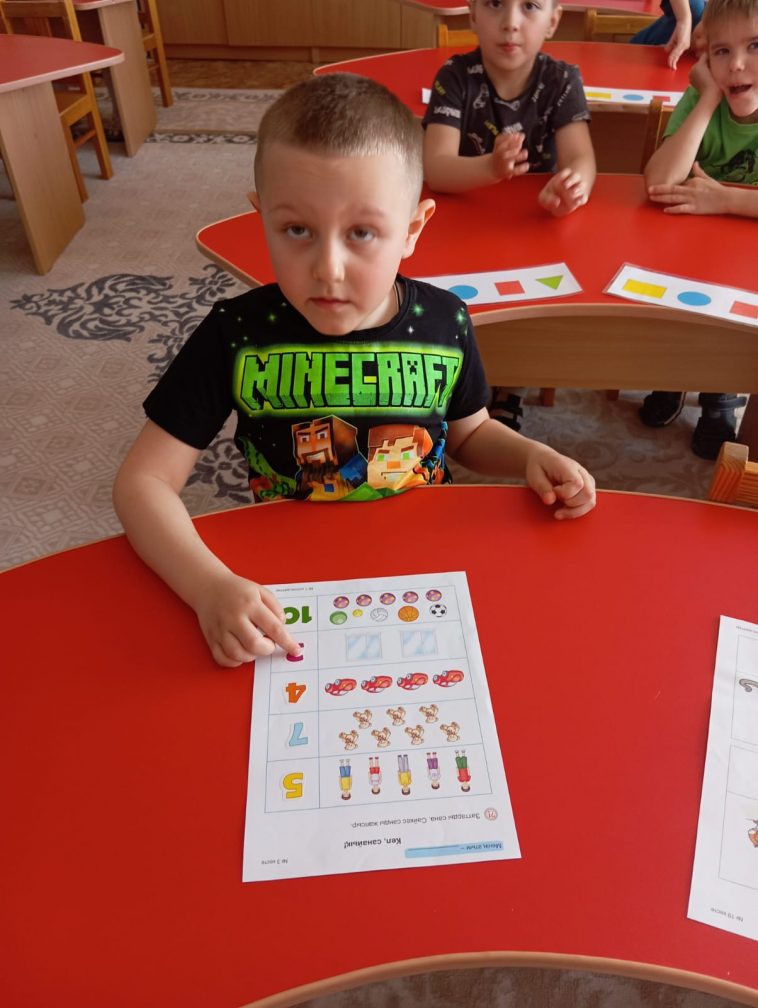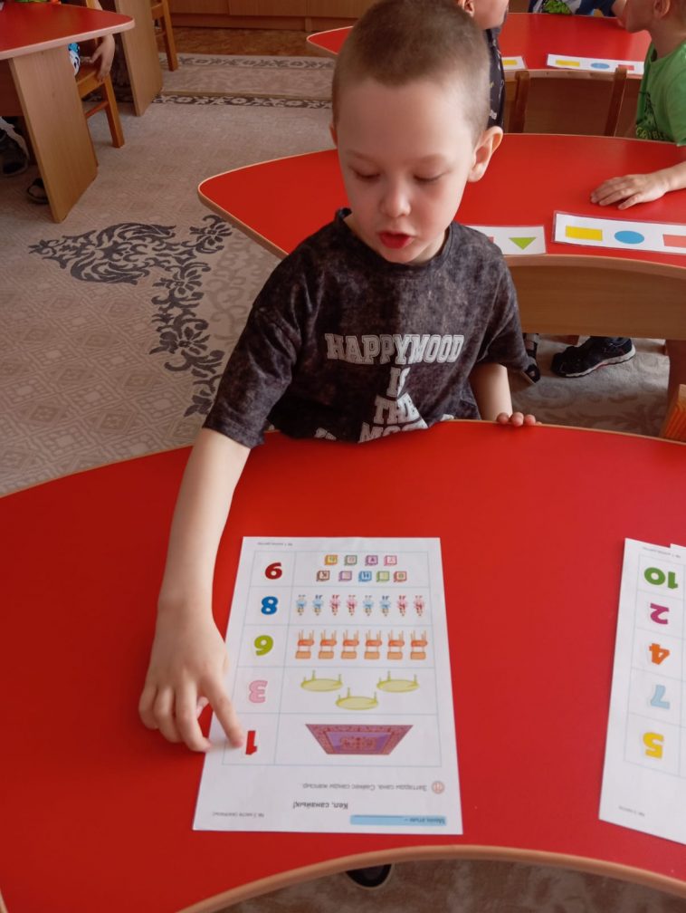 Дети предшкольной группы №5 «Балапан» в ходе учебной деятельности по казахскому языку повторяют геометрические фигуры, цвет, на казахском языке, выполняя план, разработанный в рамках пилотного проекта «Тілге бойлау».