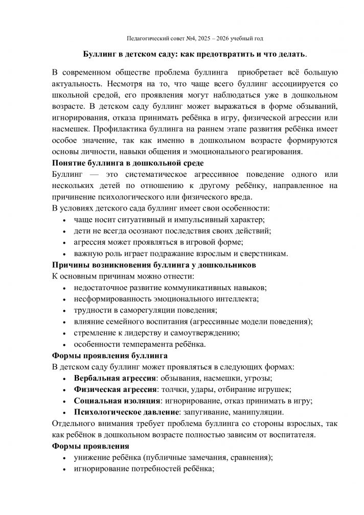 31.03.2026 күні «Балдырған» балабақшасында өткен педагогикалық кеңес барысында психолог Кузьминова Н.В. «Балабақшадағы буллинг: оны қалай алдын алуға болады және не істеу керек» тақырыбында баяндама жасады.